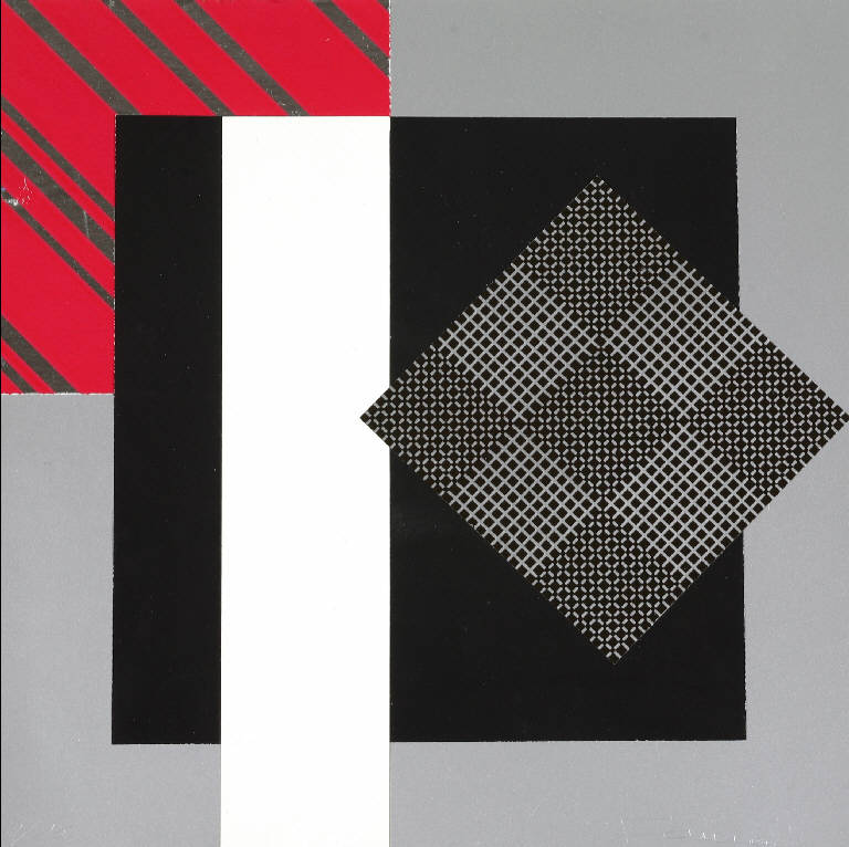 Composizione a collage di forme geometriche: un rettangolo bianco e un quadrato a griglia d'argento su un quadrato nero su fondo argento. In alto un quadrato e strisce rosse.
