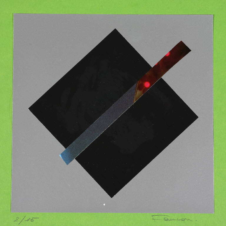 Composizione a collage di forme geometriche: un rettangolo stretto e lungo in diagonale su un quadrato nero centrale rispetto a uno piu' grande argentato; tutto su un fondo verde acido.