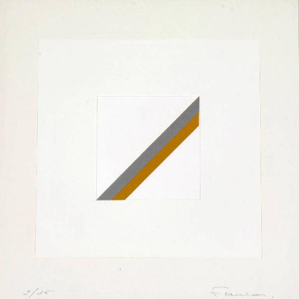 Composizione a collage di forme geometriche costituita da una sovrapposizione su fondo bianco di due quadrati bianchi; all'interno del piu' piccolo in diangonale due trapezi di colore argentato e ocra.