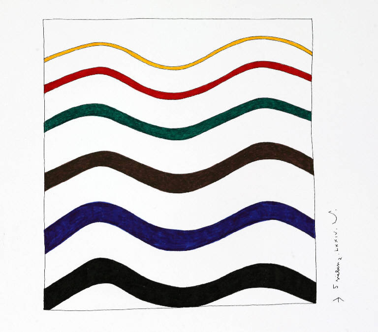 Composizione caratterizzata da un quadrato attraversato da fasce ondulate colorate; la piu' grande di colore nero si trova alla base.