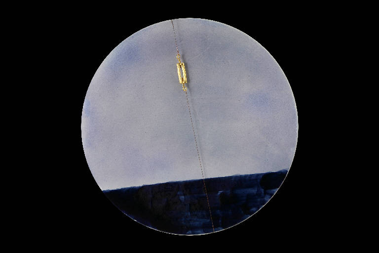 Opera di formato circolare in ceramica di colore blu e azzurro con elemento metalico trasversale.