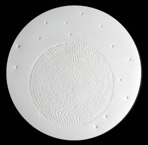 Opera di formato circolare in ceramica smaltata bianca caratterizzata dalla presenza al centro di segni graffiti concentrici e da una serie di buchi.