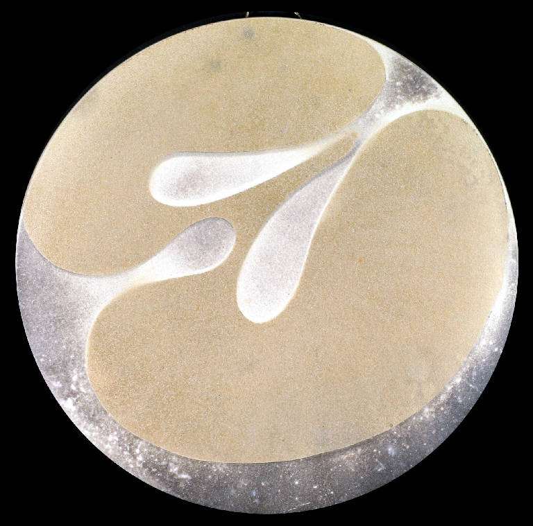 Opera di formato circolare in ceramica caratterizzata dalla presenza di forme astratte sinuose al centro della composizione su fondo prevalentemente oro.