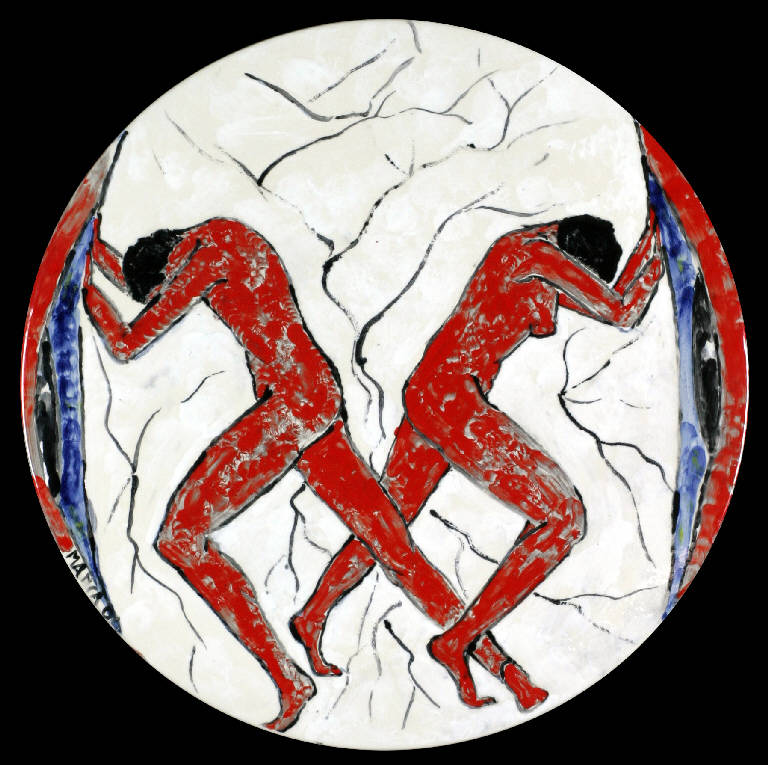 Opera di formato circolare in ceramica policroma raffigurante un nudo maschile ed uno femminile di profilo. I due corpi, l'uno di spalle all'altro, sembrano spingere invano quello che potrebbe essere un muro.