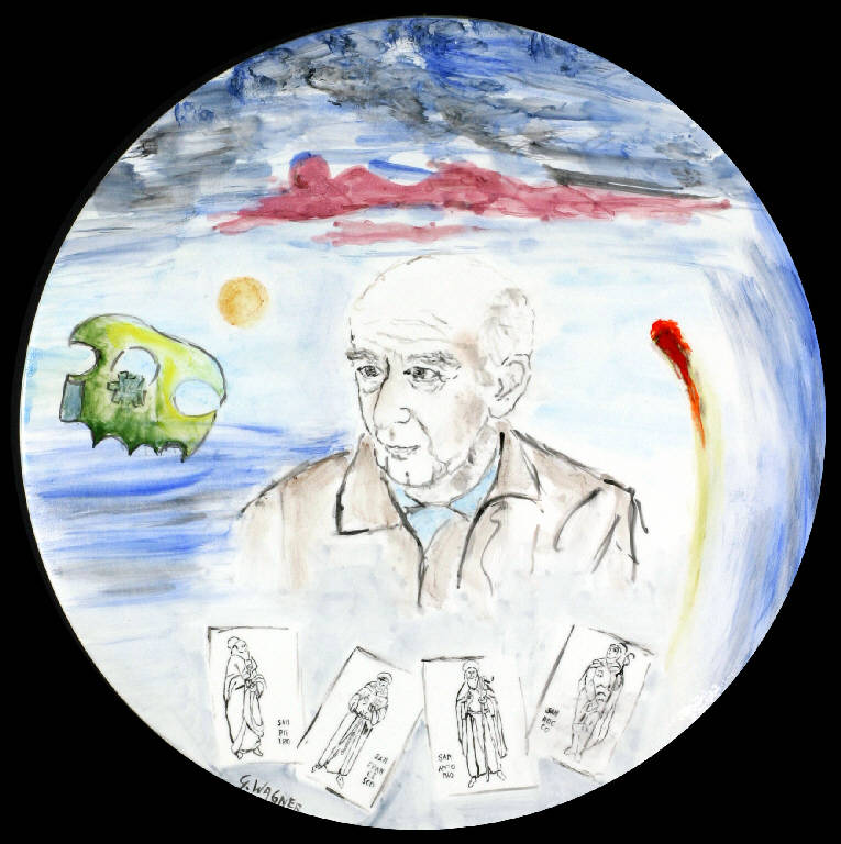 Opera di formato circolare in ceramica che raffigura il ritratto a mezzo busto di Silvio Zanella con le figure di San Pietro, San Francesco, Sant'Antonio e San Rocco.