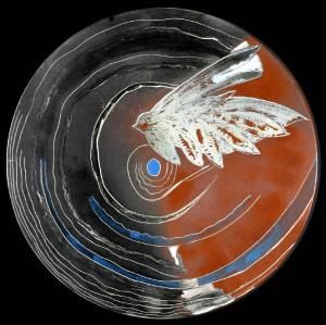 Opera di formato circolare in ceramica policroma caratterizzata da segni circolari incisi e da una colomba a destra che si staglia su un fondo marrone e nero. Al centro del tondo una sfera blu smaltata.\n.