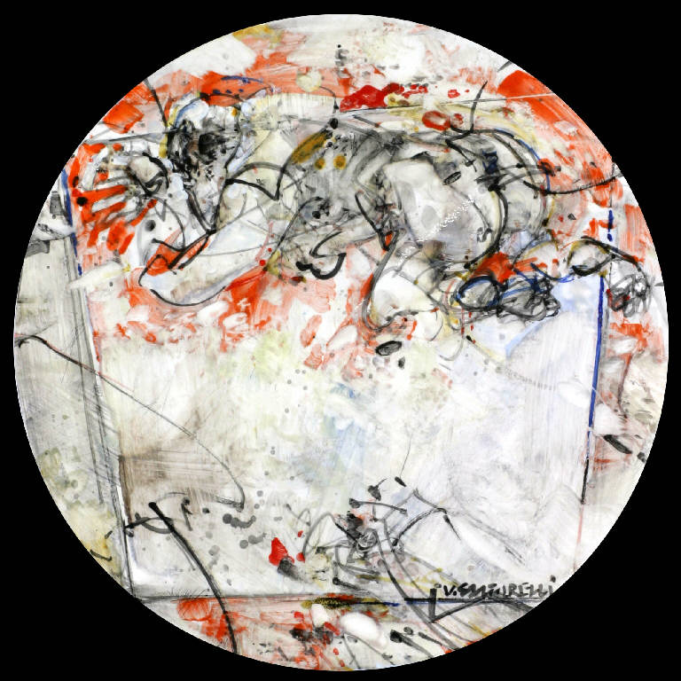 Opera di formato circolare in ceramica policroma caratterizzata nella parte superiore da una figura umana con gambe rannicchiate e braccia tese nell'atto di nuotare. La freschezza della linea e la libertà cromatica caratterizzano l'intera composizione.