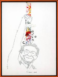 Opera a tecnica mista che ritrae il maestro Luciano Caruso. Il ritratto è eseguito con parole a corsivo a china. Parole, lettere e colori riempiono verso l'alto lo spazio del foglio.