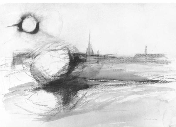 Opera a tecnica mista ch erappresenta un paesaggio. Il profilo di Torino si affaccia sull'acqua azzurra del fiume. In alto la luna. Il tratto è rapido, sfumato. Gli elementi del paesaggio non sono ben delineati, nè definiti.