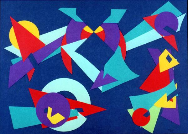Opera costituita da forme geometriche in cartoncino colorato su fondo blu, ritagliate e incastrate l'una nell'altra creando una composizione dinamica.