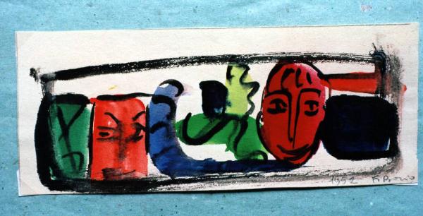 Opera di forma rettangolare allungata. Rappresenta una serie di forme pseudogeometriche fantastiche e due visi semplificati disposti su una fila orizontale e chiusi in un rettangolo nero. I colori sono vivaci e le figure sono contornate da una lineaa nera.