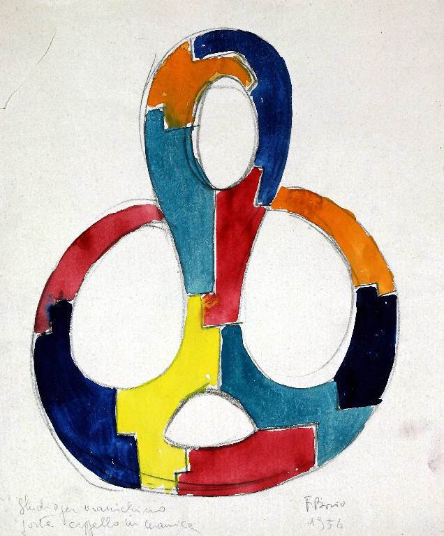 Opera caratterizzata da una composizione fluida organizzata da linee circolari e ovoidali. I colori vivaci circoscrivono zone ben definite, ma irregolari nei contorni.