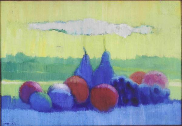 Opera pittorica che rappresenta una natura morta in primo piano descritta con colori irreali del blu, viola, rosso. Sullo sfondo campeggia un paesaggio naturalistico a morbide tinte verdi. Il cielo è giallo con al centro un ha nuvola bianca.