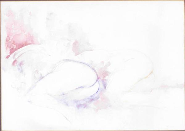 Opera pittorica che rappresenta due figure femminili nude sdraiate. I corpi sono delineati da una leggera linea sinuosa viola o gialla. Macchie di colore morbido e dilavato sullo sfondo a sinistra.