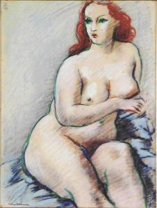 Opera pittorica che rappresenta un nudo femminile seduto. Il contorno è marcato da una linea verde in contrasto con i capelli rossi e la pelle rosata. Lo sfondo è azzurro.