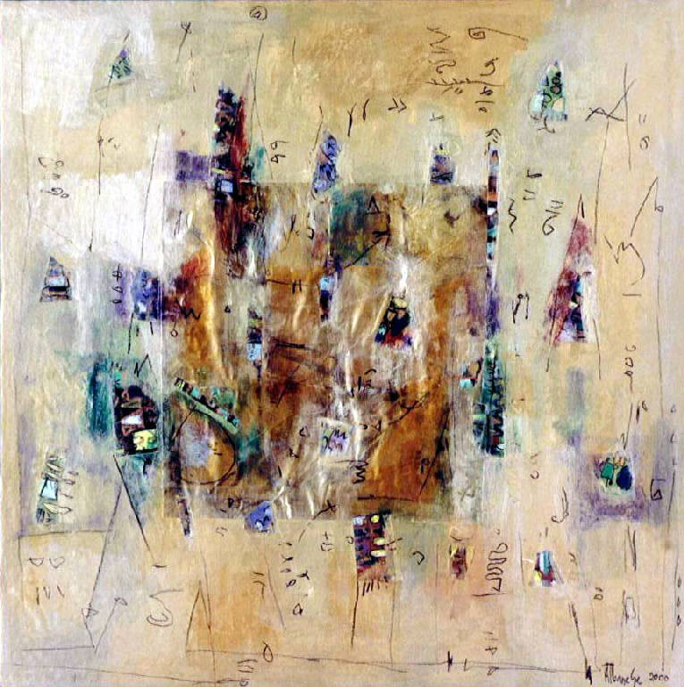 Opera caratterizzata dall'insieme di frammenti di carta colorata e di segni liberi, come fossero antichi graffiti.