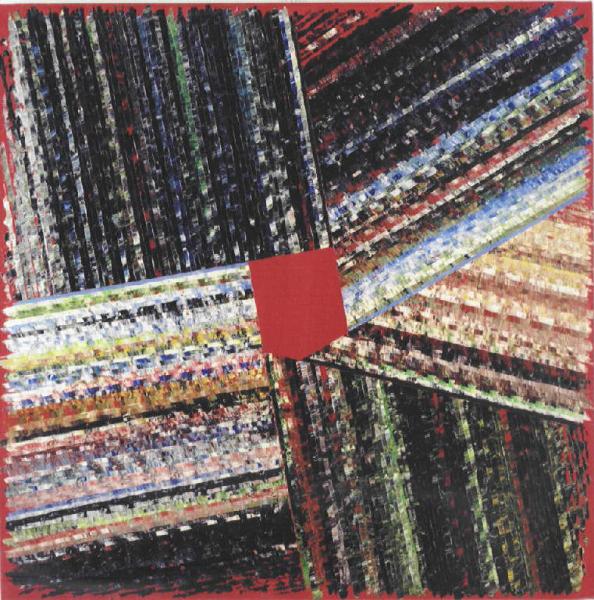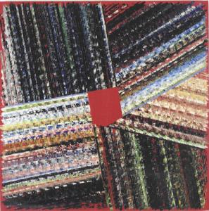 Opera pittorica di forma quadrata, costituita da una tela di colore rosso su cui insistono materiche striscioline parallele di vari colori, in varie direzioni.