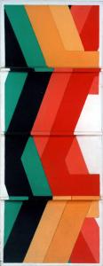 Opera in legno che si sviluppa in modo verticale con sporgenze orizzontali e paralleli, i colori sono vivaci (rosso, verde...) e stesi uniformemente.