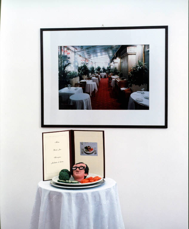 Opera composita costituita da vari oggetti: tavolino rotondo su cui sono posti un piatto con testa di Woody Allen, carote, broccoli e zucchine e la cartella del menu; fotografia incorniciata da appendere dietro il tavolo.