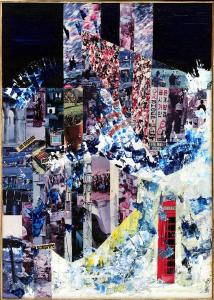 Opera pittorica a tecnica mista con interventi di ritagli uniti ad ampie zone di colore prevalentemente blu steso a colpi di spatola.