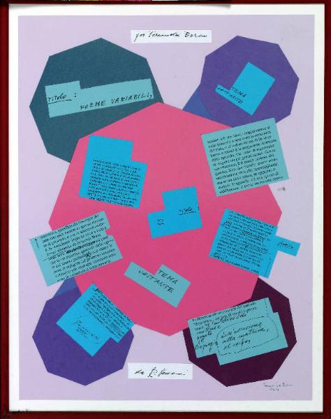 Opera costituita da una composizione di forme geometriche e colorate. I cartoncini ritagliati riportano estratti e frammenti di testi critici su Fernanda Borio.\nCornice rossa.