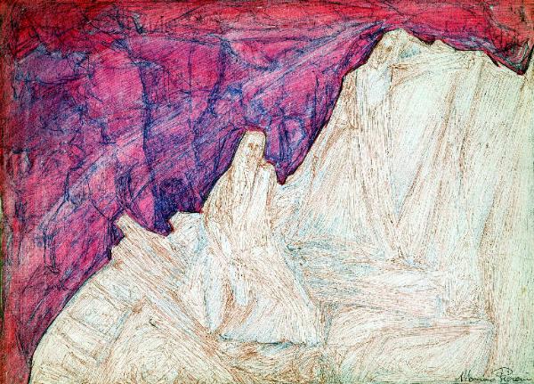 Opera composta da forme astratte realizzate con una sottile linea a pennarello. Sfondo realizzato con linee diagolnali a pennarello.\n.