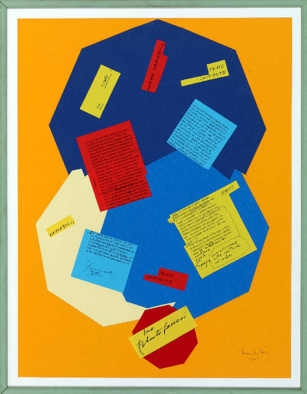 Opera costituita da una composizione di forme geometriche e colorate. I cartoncini ritagliati riportano estratti e frammenti di testi critici su Fernanda Borio.\nCornice verde.