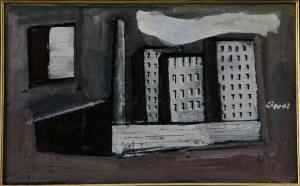 - NOTIZIE STORICO CRITICHE L'opera "Elementi di paesaggio urbano" per analogia cronologica e somiglianza con il soggetto rappresentato può essere confrontata con:\n- "Paesaggio urbano", 1938 circa;\n- "Paesaggio urbano", 1946\nentrambi pubblicati sul catalogo della mostra "Sironi" (Milano, Palazzo Reale,. 4 opttobre - 8 dicembre 1985), a cura di C. Gian Ferrari, Mazzotta, Milano, 1985 e con:\n- "Paesaggio urbano", 1942 circa pubblicata sul catalogo dela mostra "Sironi. Paesaggi", (Alessandria, 1991-1992), a cura di F. Gallo, Fabbri Editori, Milano,1991.\nAncora, l'opera può essere confrontata con:\n- "Paesaggio urbano", 1940 circa pubblicata sul catalogo della mostra "Sironi. Il lavoro e l'arte", (Bergamo, Palazzo della Ragione e Accademia Carrara, 10 luglio - 14 settembre 1997), a cura di V. Fagone e M. Margozzi, Newton, 1997.\nInfine, viene confrontata con: \n- "Periferia", 1942-1943, olio su tela 29x35 cm;\n- "Paesaggio urbano", 1942-1943, olio su tela 49x67 cm;\n-"Il gasometro", 1943-1944, olio su tela, 38x51,5 cm;\n- "Paesaggio urbano", 1945 circa, olio su carta, 52x55 cm; \n- "Il gasometro", 1945 circa, olio su tavola, 65x85 cm;\n- "Paesaggio urbano (Composizione con case e stabilimento)", 1945 circa, olio su tela, 50x60 cm;\n- "Paesaggio urbano (Paesaggio industriale)", 1952 circa, olio su tela, 50x60 cm.