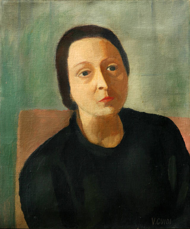 Opera che rappresenta il ritratto di una signora di mezza età. La donna, seduta, vestita di nero e con i capelli raccolti, guarda malinconicamente davanti a sè: gli occhi sono vaqui, fissi e la bocca rossa è serrata. La donna è sicuramente stata ritratta all'interno di una stanza ma si intravede solamente lo schienale marrone della sedia sulla quale la donna è seduta. Alle sue spalle solamente il muro grigio. La pennellata è corposa e giostrata in modo da creare le giuste ombreggiature soprattutto sul volto. I colori sono freddi.