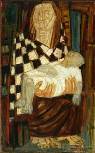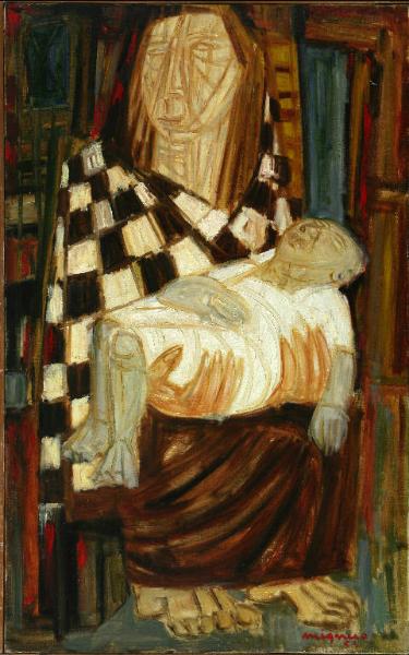 Opera che rappresenta una Maternità. La Vergine è seduta con in braccio il Bambino. La particolarità è che entrambe le due figure sacre sono dipinte e rappresentate in modo esteticamente grottesco, quasi deformi: Maria ha un volto rude, come se fosse cosparso da graffi, mani e piedi enormi e un corpo grosso e pesante; il piccolo Gesù è caratterizzato dal volto anziano, rugoso. Il suo corpicino dorme tra le braccia della mamma ma è un corpo gonfio, tanto che gli arti inferiori e superiore possiedono un colore cianotico. La Madonna porta una veste marrone nella parte inferiore e una sorta di mantella a scacchi bianchi e neri; Gesù è avvolto in un panno bianco cangiante. Lo sfondo è un insieme di colori, senza la rappresentazione precisa di nulla. I colori sono forti, squillanti tanto da rendere questa Maternità ancora più strana, angosciante, sofferente. La pittura è materica e corposa.