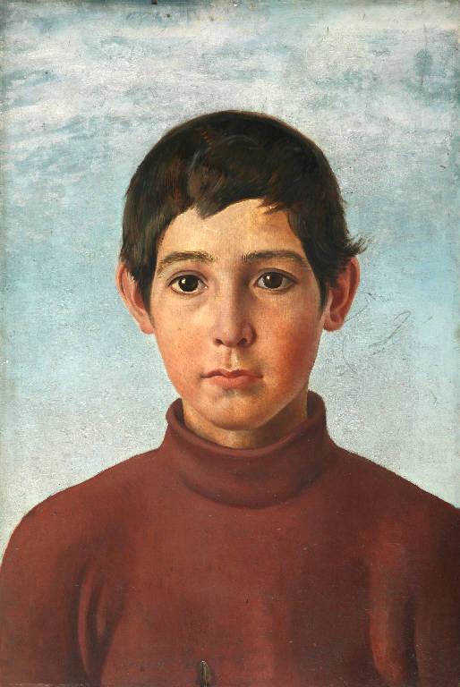 Opera che rappresenta il ritratto di un giovane ragazzo, quasi un bambino. Il ragazzo, che porta un maglione rosso scuro a collo alto, guarda fiso davanti a sè con i grandi occhi marroni sbarrati. Dietro alle sue spalle c'è uno sfondo azzurro cielo. La pennellata è corposa; i tratti ben delineati e precisi; i colori decisi e accesi.