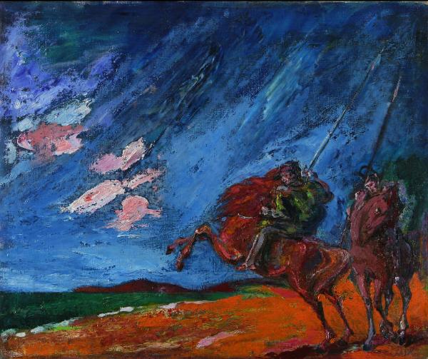 Opera che rappresenta un paesaggio di mare in cui sulla riva s'impennano due cavalli uno cavalcato da Hernàn Cortés, condottiero spagnolo che abbattè l'impero azteco e lo sottomise al Regno di Spagna, e l'altro da un un soldato del suo esercito. In lontananza si staglia la scogliera Il cielo è blu, velato da due grosse nuvole rosa. La pennellata è veloce, corposa e materica. I colori sono squillanti, brillanti.