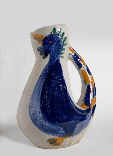 Brocca molto grande con manico in ceramica smaltata a sfondo bianco con rappresentato un grande uccello di piumeggio blu, con zampe e becco gialli e cresta verde. L'uccello ha una lunga coda policroma (gialla, verde, blu) che va a riempire il manico.