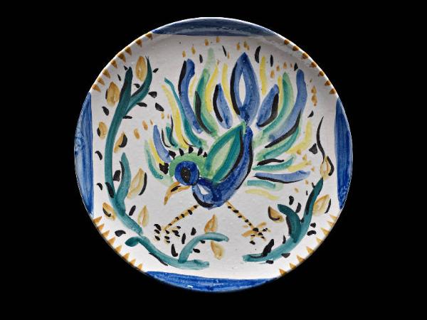 Piatto rotondo in ceramica a sfondo bianco con al centro dipinto a smalto un piccolo uccello con piumaggio blu, verde e giallo. Intorno all'uccello ci sono motivi astratti sempre di colore blu, giallo e verde. Intorno al perimetro del piatto ci sono lunette blu (sopra, sotto, a destra e a sinistra) e piccoli triangoli gialli tra le lunette.