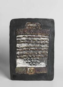Tavoletta in ceramica raku rettangolare decorata con rettangolo più piccolo realizzato in smalto bianco. Tale rettangolo a sua volta è decorato con motivi orizzontali e di fantasia realizzati con lustri d'oro.