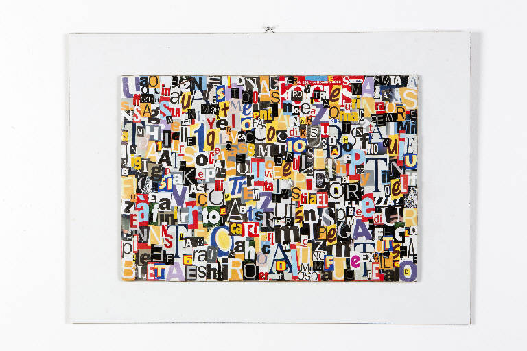 L'opera è una composizione di lettere colorate ritagliate da riciste e giornali e incollate una accanto all'altra senza che compongano parole di senso compiuto.