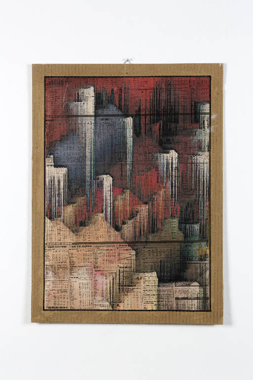 L'opera rappresenta grattacieli di una città contemporanea sullo sfondo di una pagina di giornale su cui sono riportati gli indici di borsa dell'andamento del mercato.