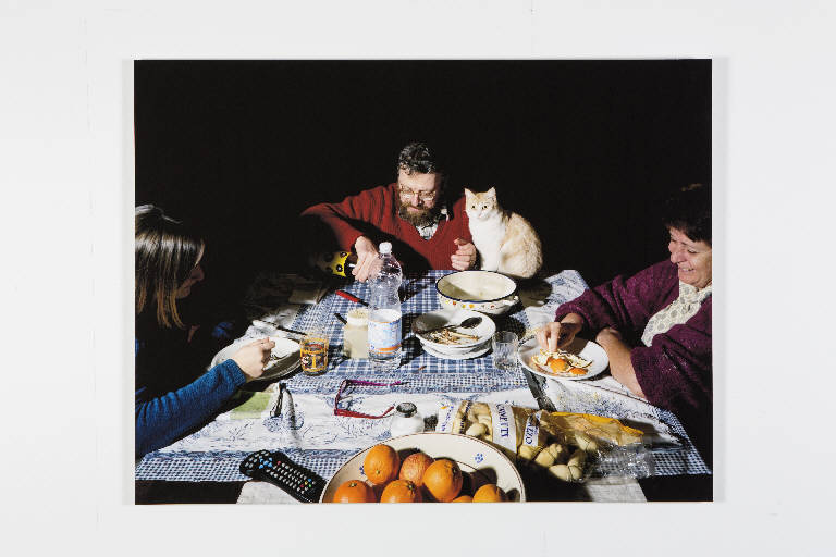 Ghe' pronto! è un progetto che analizza il momento del pasto all'interno della famiglia italiana infatti la serie presenta cinque scene di gente comune mentre condivide il pasto a tavola. Questa fotografia rappresenta una famiglia di tre persone: mamma, papà e figlia adolescente; a capotavola accanto al papà è seduto anche un gatto. Le persone sono riprese intente a mangiare e non guardano l'obiettivo. Le figure emergono da un fondo nero.