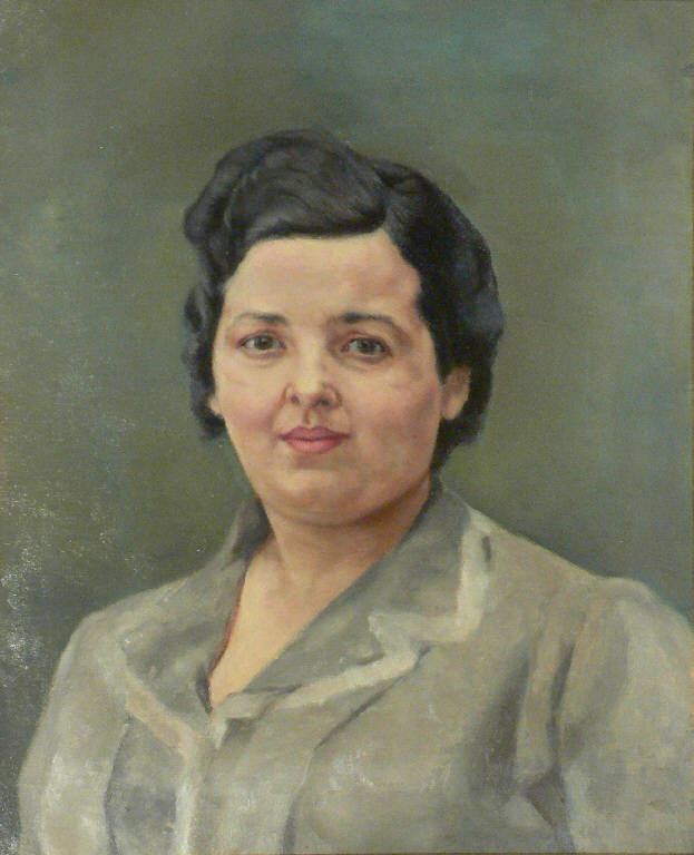 Ritratto di signora a mezzo busto. Presenta capelli neri corti o raccolti e un abito grigio chiaro. Anche lo sfondo è nelle tonalità del grigio.