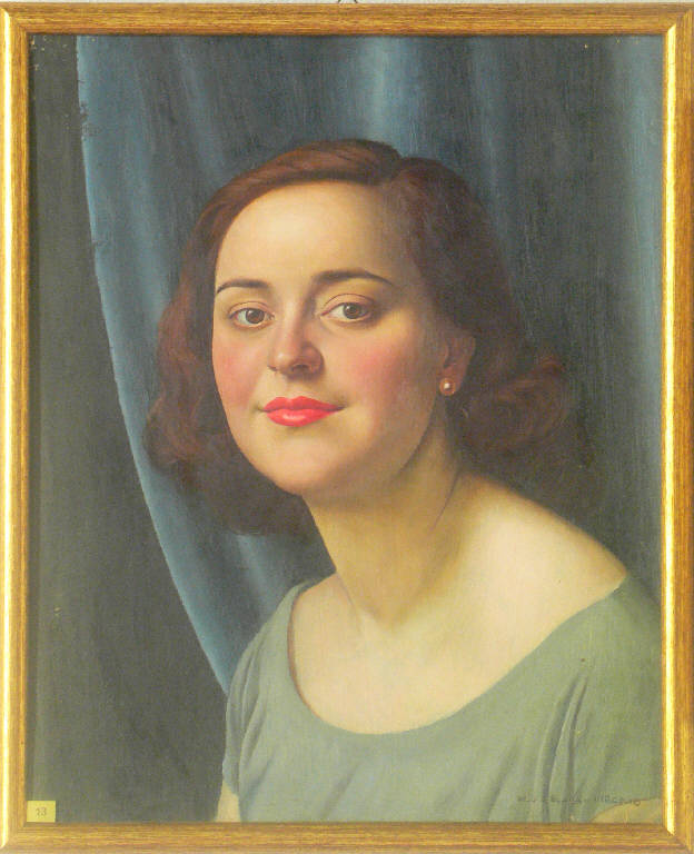 Ritratto di giovane donna. Particolare la forte tonalità del rossetto e la brillantezza dell'orecchino di perla, in contrasto con i toni attenuatti e spenti dello sfondo e dell'abito indossato dalla giovane.