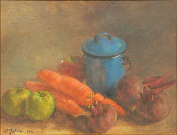 Natura morta raffigurante un pentolino blu, tre rape, tre carote, due mele verdi ed una rossa su fondo marrone chiaro e scuro.