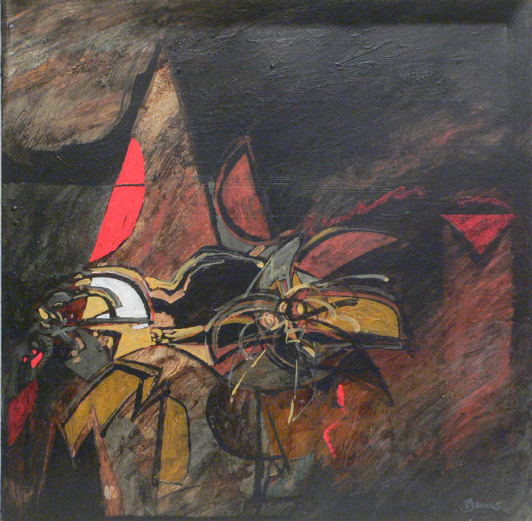 Composizione astratta di figure geometriche e colori, nelle tonalità del rosso, del beige e del nero, con un'unica piccola campitura bianca sulla sinistra.