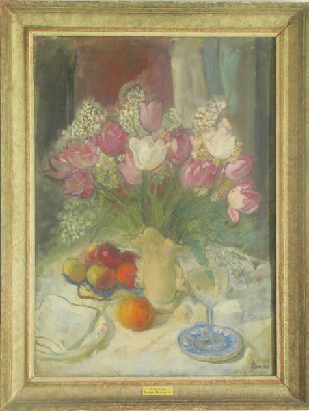 Vaso di fiori appoggiato ad una tavola imbandita. Sul lato destro è raffigurato un bicchiere a stelo lungo appoggiato su un sotto-bicchiere. Sul lato sinistro un recipiente pieno di frutta e un piatto ricoperto da un tovagliolo