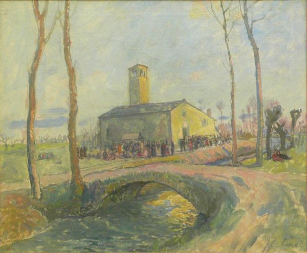In primo piano è raffigurato un fosso, alberi spogli lungo le rive e un ponte che lo attraversa. Nel centro della scena una chiesetta gialla con davanti molte persone. Sullo sfondo alberi spogli e cielo azzurro.