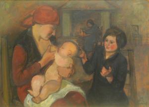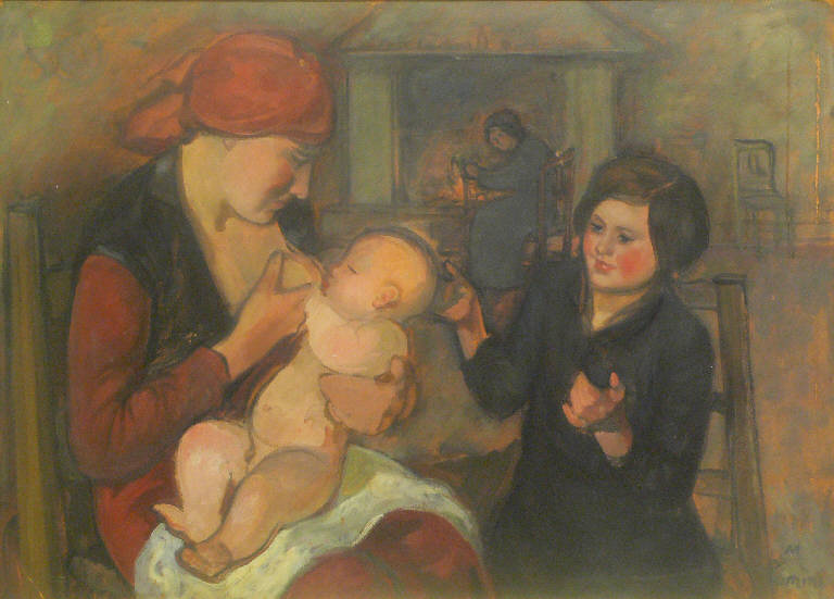 In primo piano donna che allatta un neonato, sul lato destro è raffigurata una ragazzina in abito nero. Sullo sfondo un camino acceso con davanti un'anziana seduta. Sul lato destro una sedia.