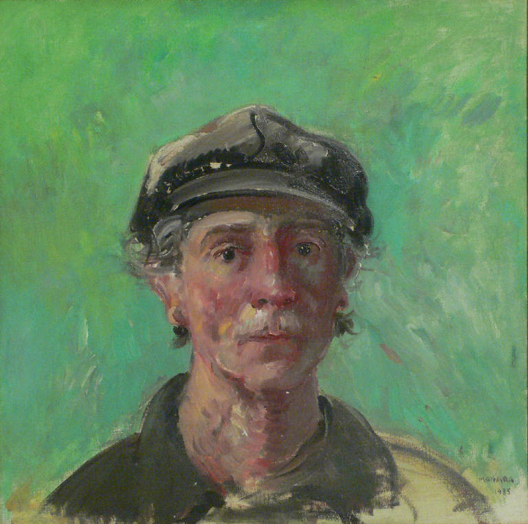 Volto di uomo di mezza età con baffi e berretto, su fondo verde.