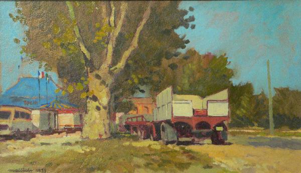 Veduta con al centro due camion visti da dietro, un grosso albero al centro e sulla sinistra un tendone del circo, riportante la scritta "Togni", con davanti i carrozzoni. Al centro in mezzo agli alberi si intravede l'esedra di Palazzo Te.