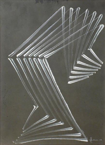 Su sfondo nero studio stilizzato in bianco. Serie di reticoli in successione e aperti a ventaglio sull'intera superficie