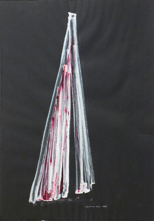 Su sfondo nero studio nei toni del bianco e del rosa. La forma piramidale della figura è realizzata attraverso elementi verticali posizionati a ventaglio.