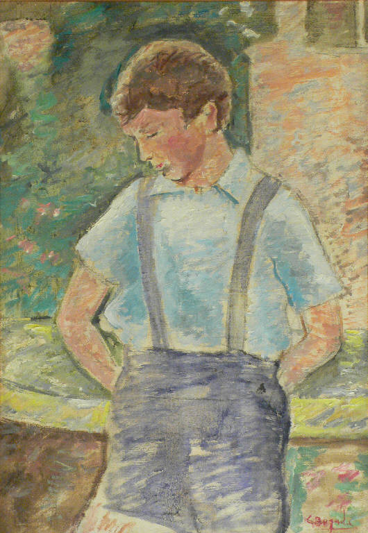 Ritratto di bambino dai capelli corti e castani, il viso di profilo e gli occhi chiusi, le mani sono dietro la schiena e lui è appoggiato ad un parapetto. Indossa una camicia a maniche corte azzurra, pantaloncini corti blu con bretelle. Alle spalle del bambino si nota sulla destra una struttura di colore rosa-arancio inserita in un giardino.